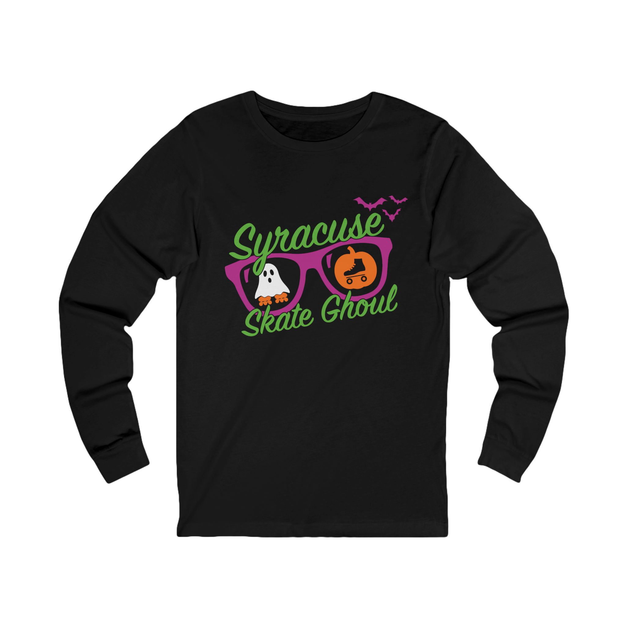 This classic-fit tee features long sleeves in unisex sizing (size up for a looser fit!). Made with lightweight 100% Airlume combed cotton with a ribbed knit collar. Available in black printed with a macabre mix of creepy colors. Please note our SSG Spooky merch features a special edition “Syracuse Skate Ghoul” logo on the front and a Cemetery Skate VII gravestone and “#skatersgonnascare” hashtag on the back.
