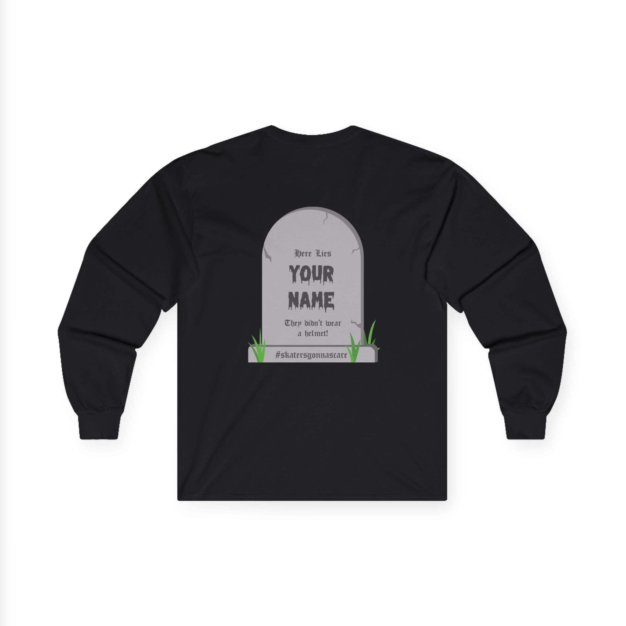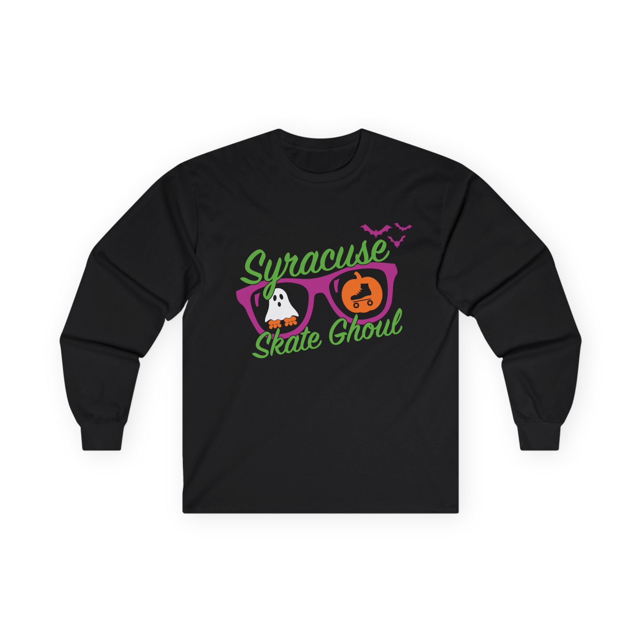 This classic-fit tee features long sleeves in unisex sizing (size up for a looser fit!). Made with 100% cotton in a tubular knit with no side seams and a sewn-in label. Available in black printed with a macabre mix of creepy colors. Please note our SSG Spooky merch features a special edition “Syracuse Skate Ghoul” logo on the front and a personalized gravestone with “#skatersgonnascare” hashtag on the back.