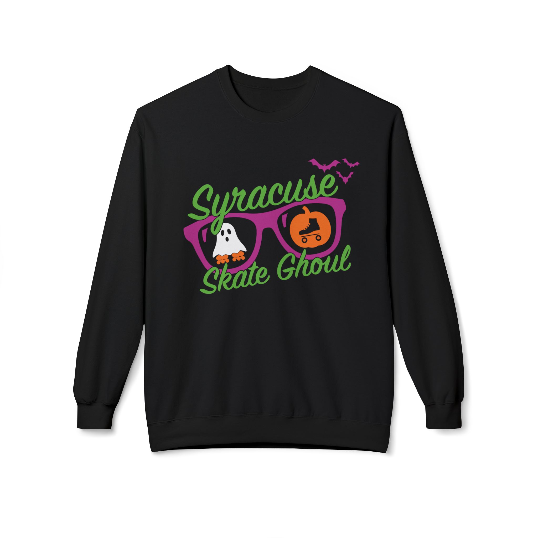 This cozy crewneck sweatshirt fits comfortably loose in unisex sizing. Made from an 80% ring-spun cotton/20% polyester blend in a tubular knit with no side seams, featuring dropped shoulders and ribbed cuffs and bottom hem. Available in black printed with a macabre mix of creepy colors. Please note our SSG Spooky merch features a special edition “Syracuse Skate Ghoul” logo on the front and a personalized gravestone with “#skatersgonnascare” hashtag on the back.